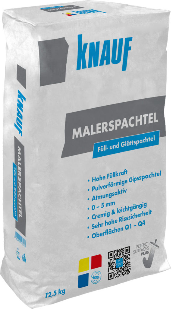 Knauf Malerspachtel ist ein auf Gipsbasis aufgebautes, kunststoffvergütetes, pulverförmiges Spachtelmaterial. Knauf Malerspachtel wird zum vollflächigen Verspachteln, zum Füllen von Löchern, Fugen und Rissen, sowie zur Erstellung hochwertiger geglätteter Oberflächen auf allen bauüblichen Untergründen verwendet (z.B. Beton, Porenbeton, Gipsplatten, Putze).